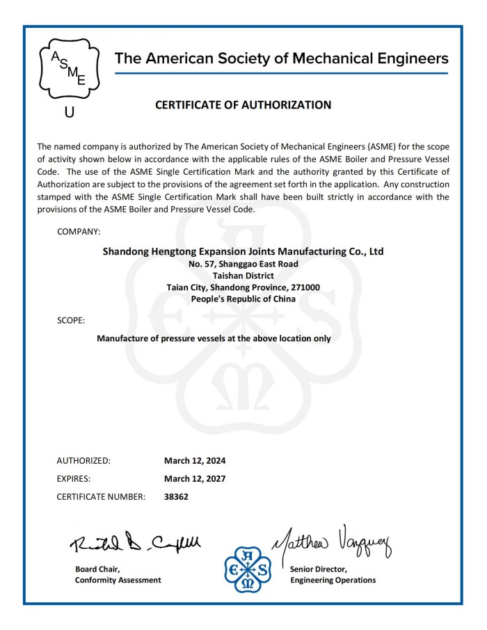 山東恒通膨脹節制造有限公司是一家集研發、設計、制造、銷售和服務于一體的大型膨脹節制造企業。公司取得我國特種設備制造許可證、壓力容器A1級資質、壓力管道元件A、B的資質,并且獲得了歐盟PED-CE認證、美國ASME“U”鋼印、ISO 9000質量管理體系認證、GB/T 14000 環境管理體系認證及GB/T 45000 職業健康安全體系認證。膨脹節產品涵蓋壓力管道波紋膨脹節、壓力容器波形膨脹節、金屬波紋管、金屬軟管...